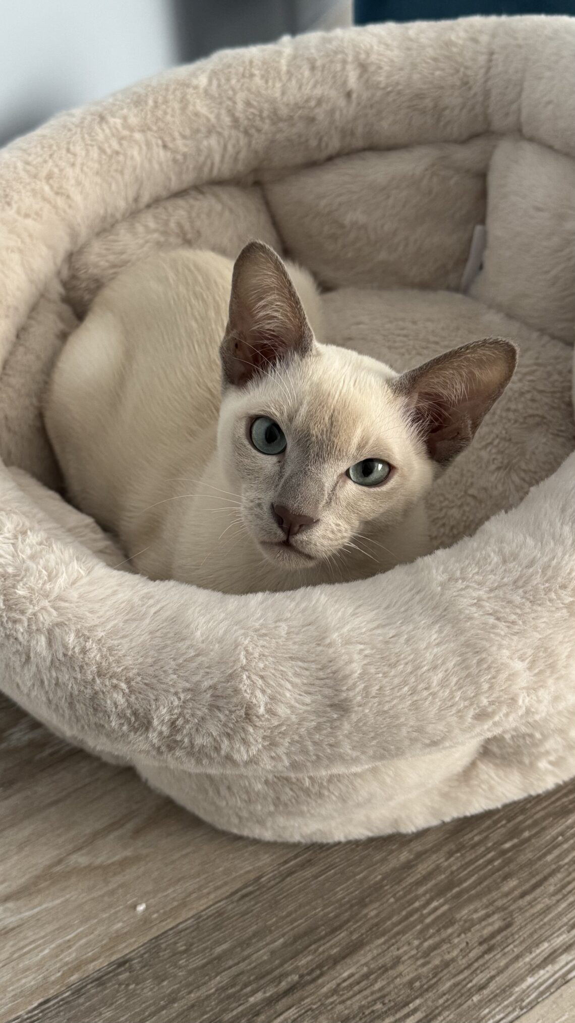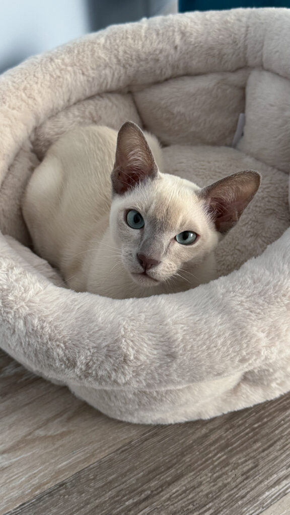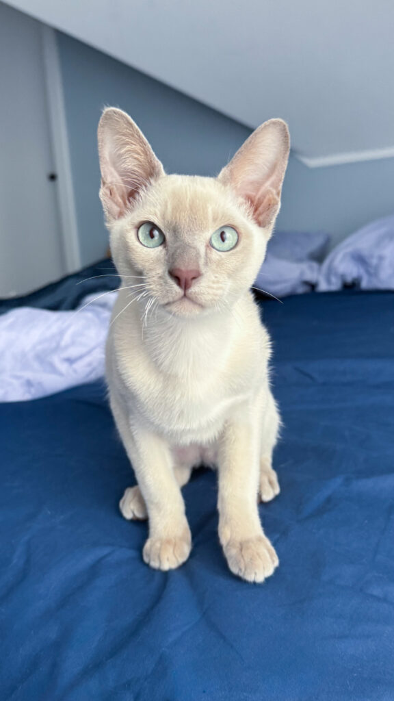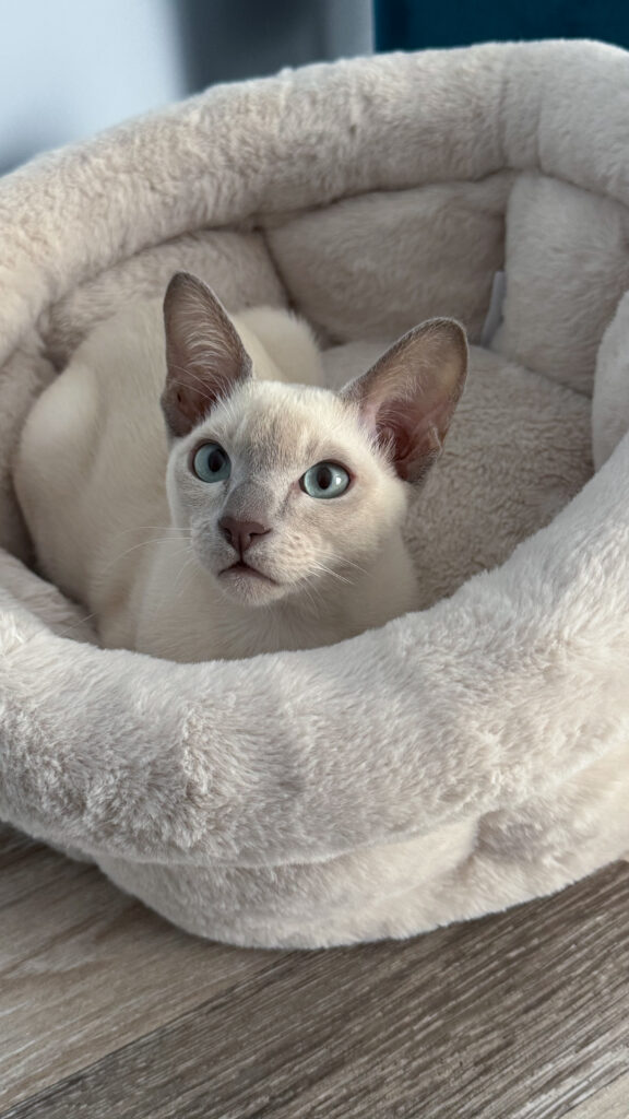 Hermes to kocur w umaszczeniu platynowy mink, dodatkowo niesie gen cynamonu. Jest niezwykle inteligentny, sprytny i ciekawski — wszędzie musi zajrzeć i niczego się nie boi. To prawdziwy wulkan energii, który zawsze pierwszy sprawdza nowe miejsca, dźwięki i przedmioty.